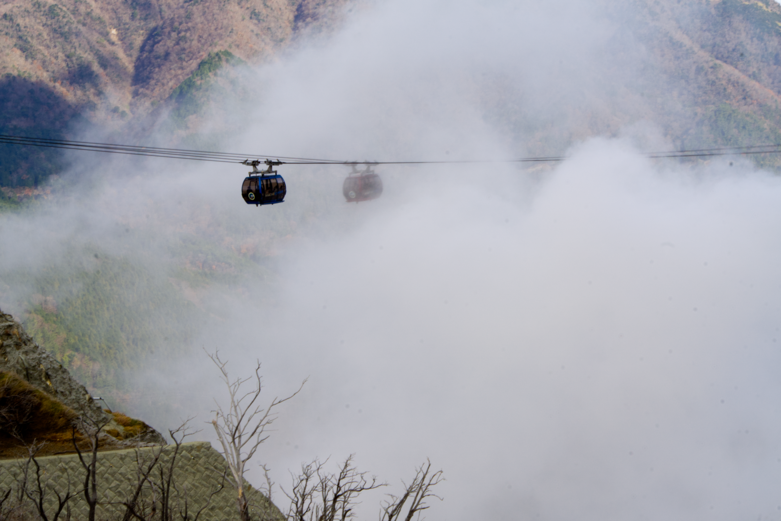 Nous rendons la chambre pour 10h, puis partons prendre le téléphérique pour monter à Owakudani, une vallée volcanique au cœur du mont Hakone d’où s’échappe des fumeroles de souffre.